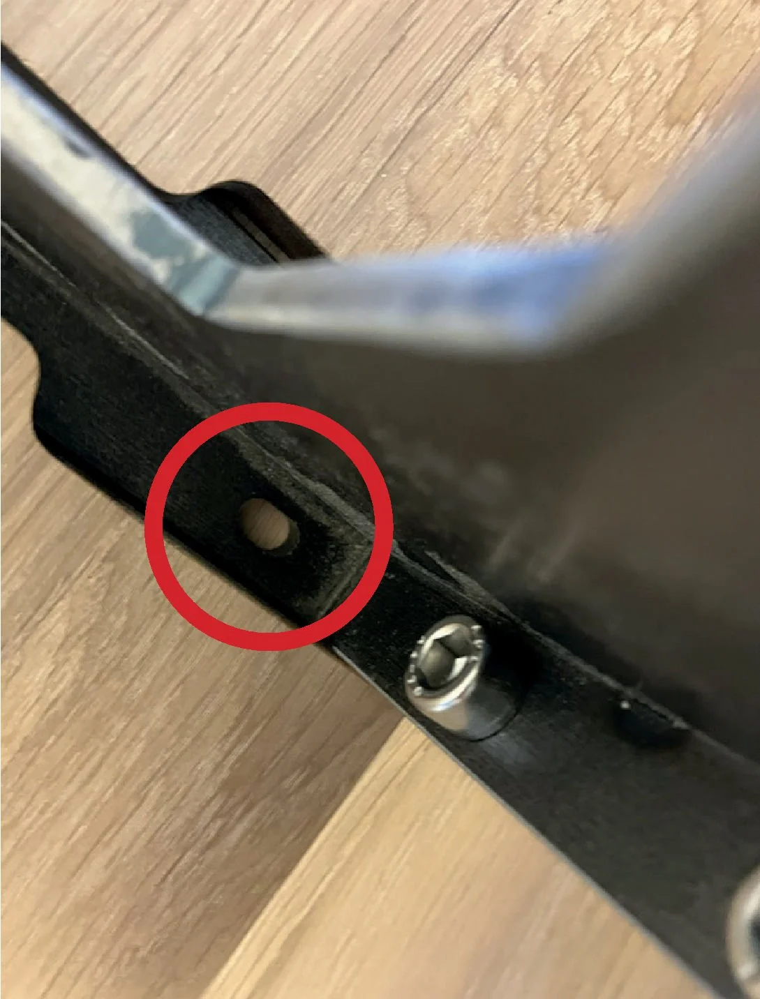 Skru medfølgende treskrue inn i det innerste hullet på benet (Se bilde med rød ring)