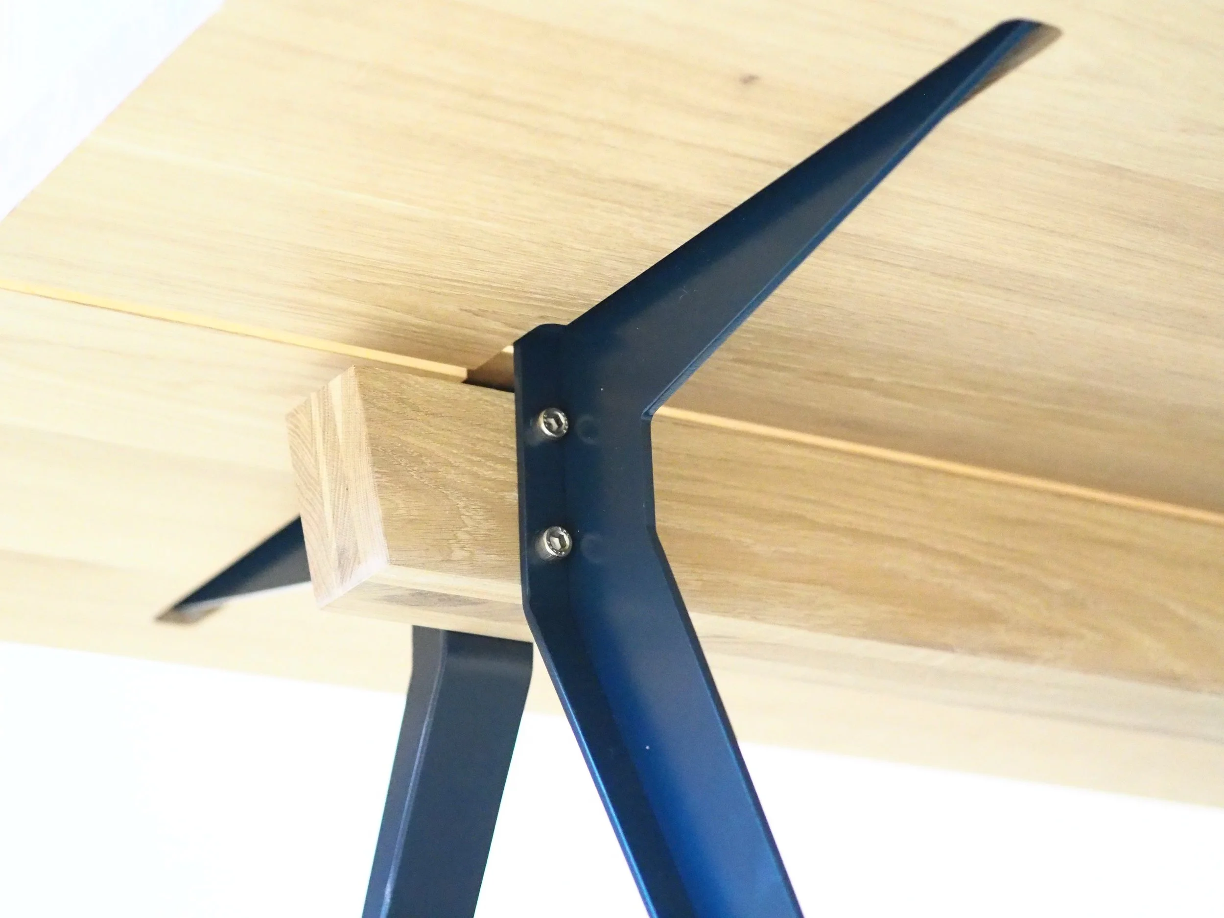 Benas utforming er genistreken på SCHWENSEN bord. De er laget for å bære bordplatene uten sarger og innfesting. Prinsippet er at bena monteres på midtbalken og gjør hele understellet selvbærende og frittstående. Platene tres så inn på armene i slisser som er frest under bordplatene. De festes kun med en liten skrue innerst på benet for at serveringsfjøla LOUISE skal ha et fast spor å ferdes i. Dette gjør at bordplatene kan bevege seg fritt uten at det blir spenninger og sprekker i platene. Treverk er et levende materiale og forandrer seg med temperatur og luftfuktighet. I Norge som har store variasjoner i vær og vind, mener vi det er viktig at platene kan bevege seg for at formen på bordet skal holdes seg.